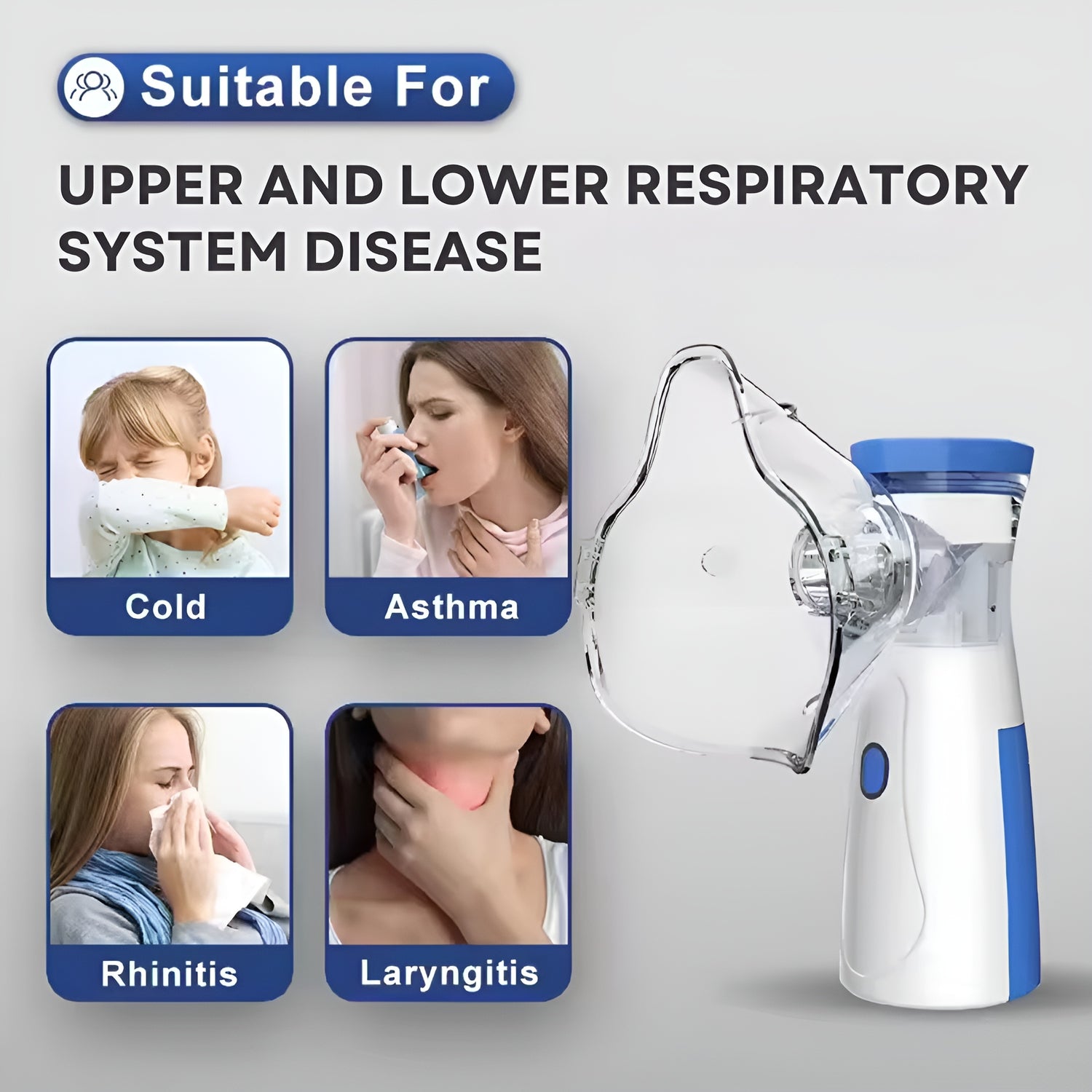 Attach the mask or mouthpiece, add the prescribed liquid medication, press the one button power, and inhale slowly. The fine mist reaches deep into your lungs for fast, effective relief.